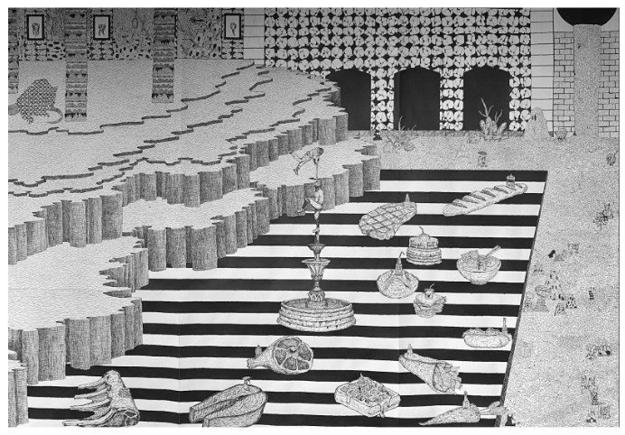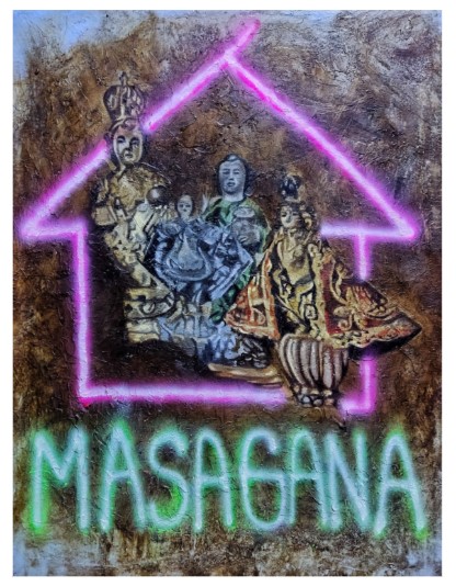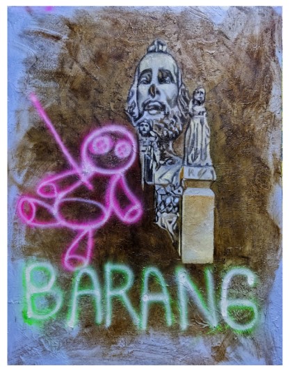 Belda's works are culled from his childhood memory. Alludes to winning over an enemy be it foreign or alien, a warning not to be enslaved by money and materialism.