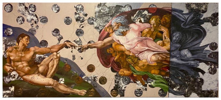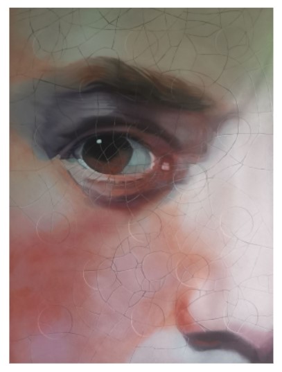 Harkening back to an era when painters paid particular attention to the luxurious feel of precious beauty around them, we are amazed by the virtuosity of Randy’s detailed brushwork in his mannered impersonation of classical paintings. In Mimesis, Randy concerns himself with the fine textures of hair, fabric, wings, and skin... But he did imbue his playfulness and fondness for contrasting mechanisms provided by layered dual-canvases, diptychs, dot-contouring, and even time-thumb stamped his works with cracks. Shaped canvases are generally considered paintings, and arguably, changing the surface configuration of the painting would transform the painting into a sculpture. So, is Randy embarking on the journey of being a sculptor next?