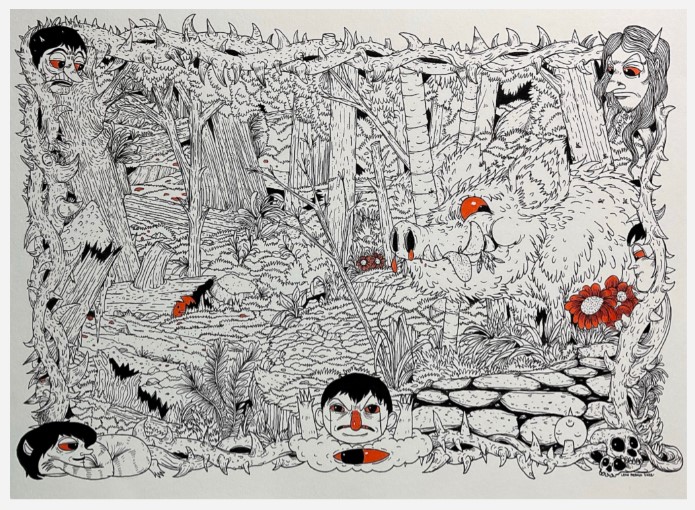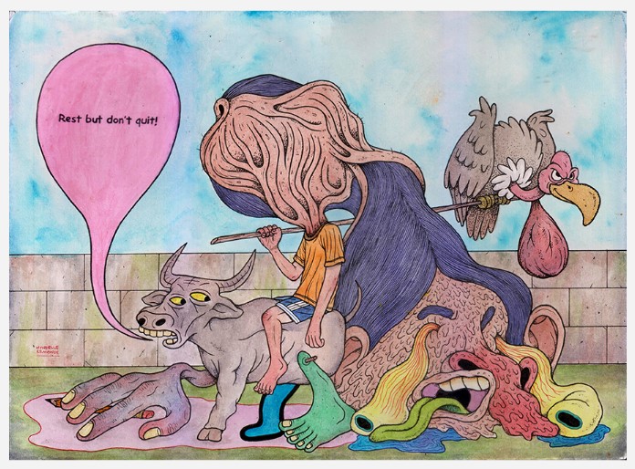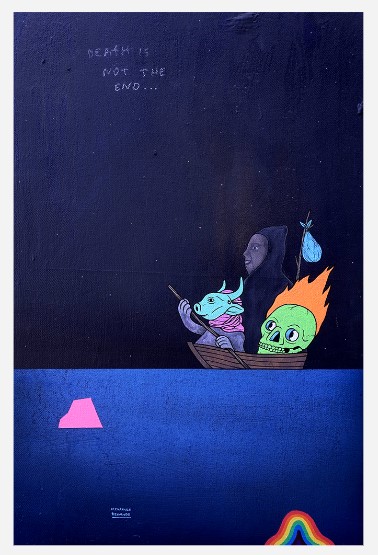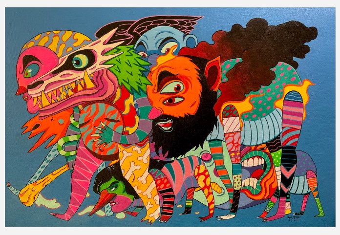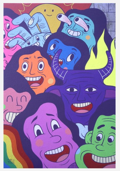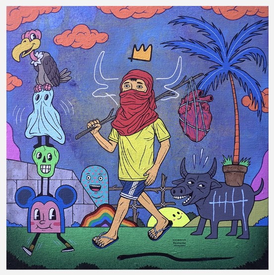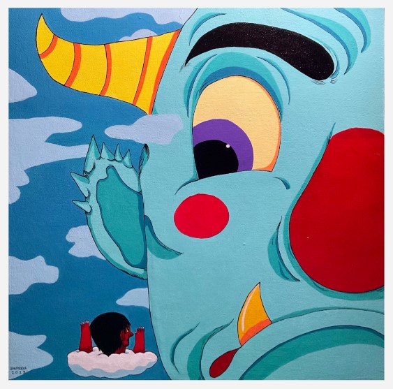 Lean Luis Reboja (b. 1991) was born in Davao, but is currently residing in Cebu. He studied at the University of the Philippines - Cebu. Lean, whose works have been attributed towards illustration art more than just traditional painting, have created works in formal art settings such as galleries and pop up art exhibition venues in the local scene. He also goes by the moniker name “Leanderthal” which is commonly associated with the Dreamcloud icon, noticeable in his works. Each piece is intricately done with a narrative of a snippet of his life, an aspect dissected by many of his collectors. Reboja delves into creating sporadic and colorful characters, usually having a closely relative appearance with beasts and animals. These are then set against each other, a juxtaposition of them all together in one art composition. The signature figure of the “Dreamcloud”, a cloud-riding biographical character whose arms are raised to heaven is placed often on each artwork, depicting the artist as an individual that fervently aims in achieving his ambitions in life. Lean’s autobiographical themes usually signify events and memories, human behavior, experiences and emotions set into a metaphorical way of artistic expression. His art relays all these concepts in a riddle packed with intricately drawn and painted elements.